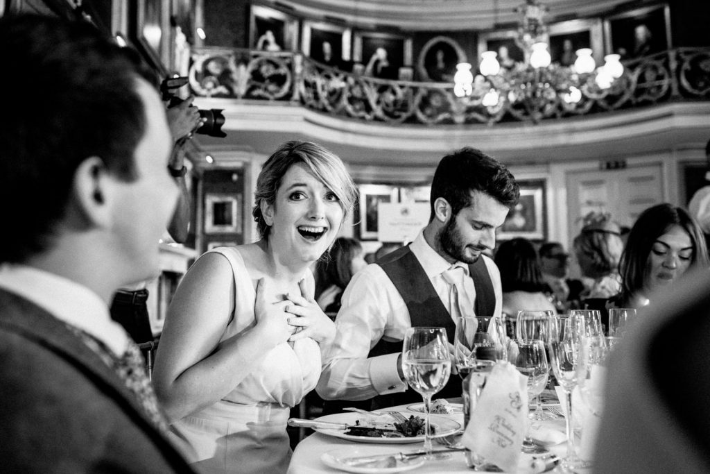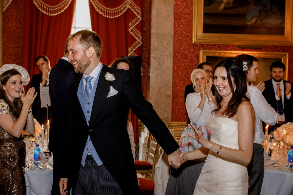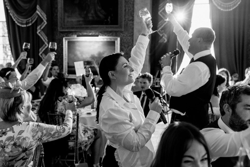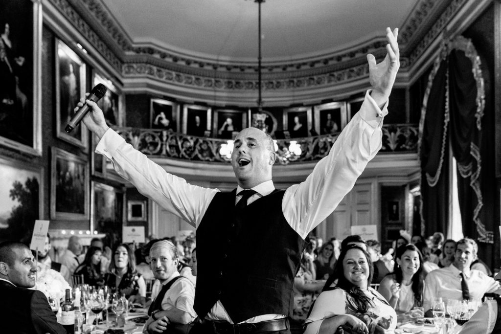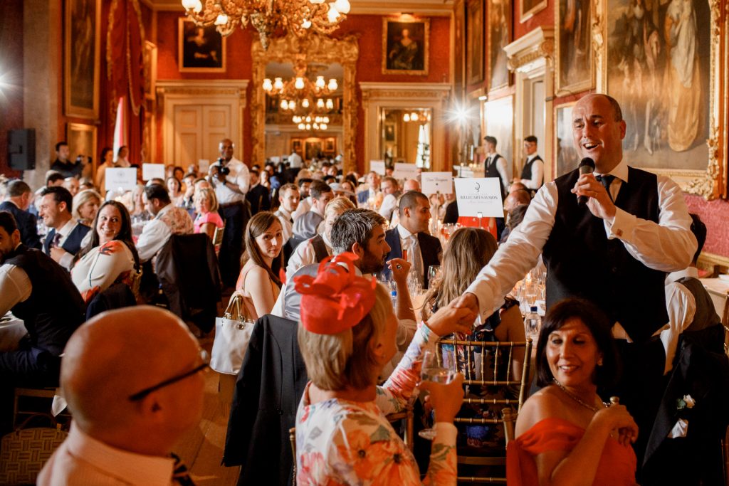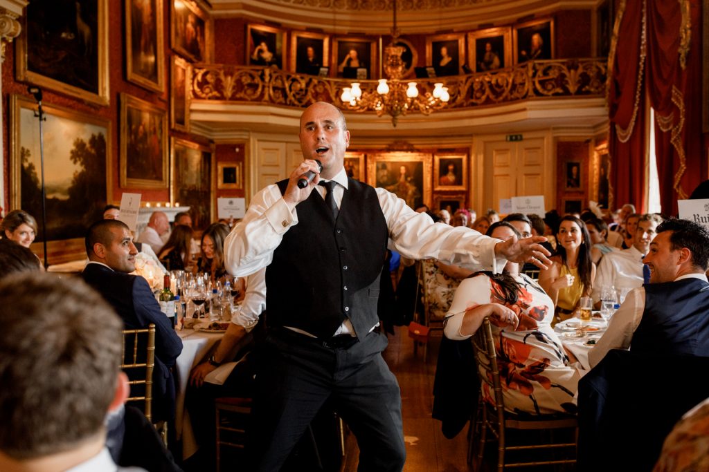 The wedding reception was held at the amazing Goodwood House. It’s only when you arrive at Goodwood House that you get a feel for the size of this venue, with it’s adjoining airfield, hotel, racetrack and golf course. The reception room is stunning with artwork spreading across the vast walls making a breathtaking entrance for guests before dinner…..and if this did not take the wind from them then Karena and Adam’s incognito opera singers surely would.