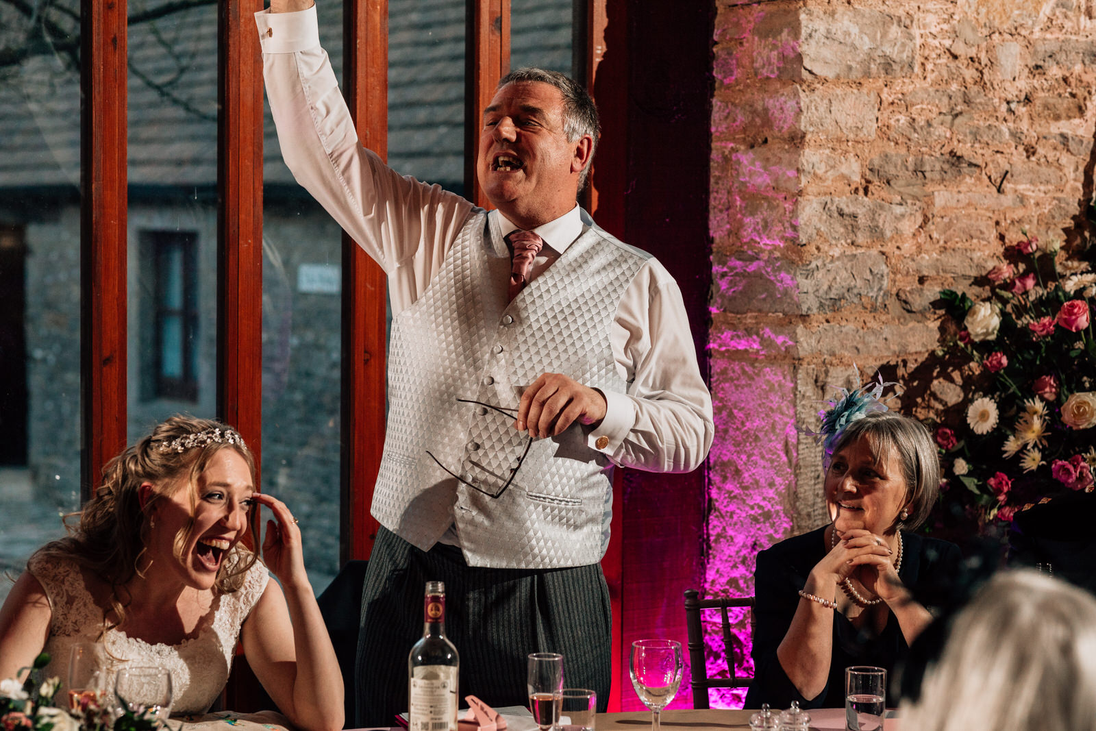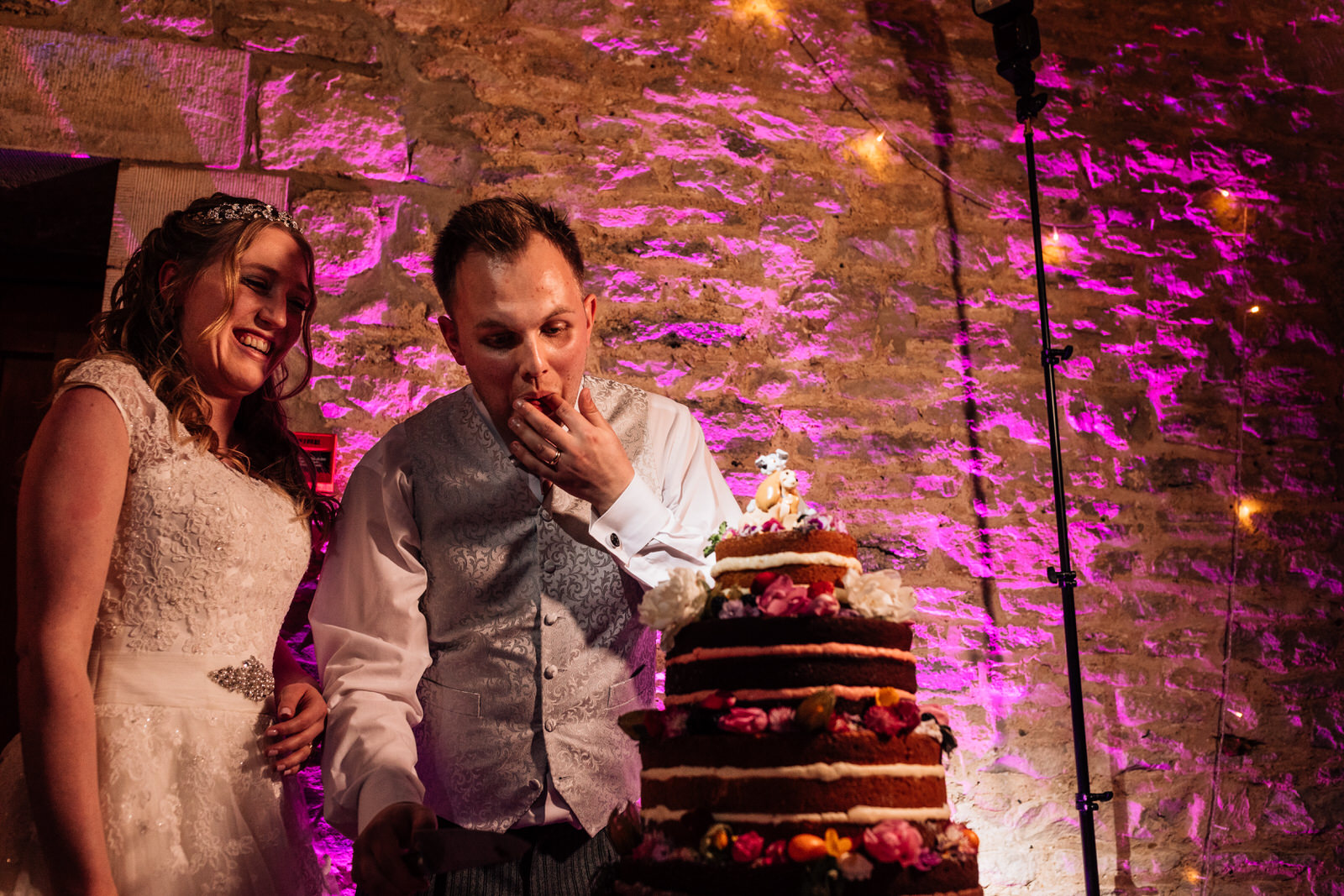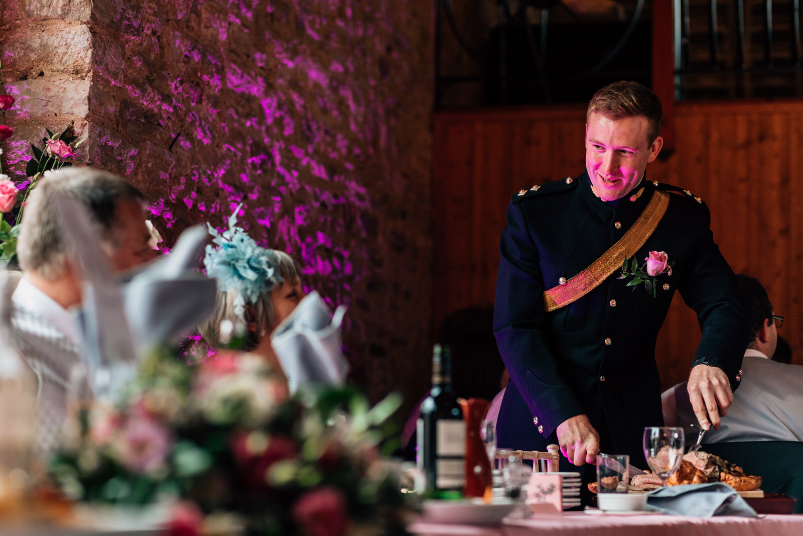 The reception and wedding breakfast were held in the farmyard style venue, with guests spilling out into the gardens during the reception. People were led to the wedding breakfast by Sarah, not with the traditional receiving line, but in her own style – a conga line.  Once in their seats caterers brought out ready to carve roasted beef with all the trimmings, each table getting their own beef to carve with the bravest guests taking the knife and playing chef.