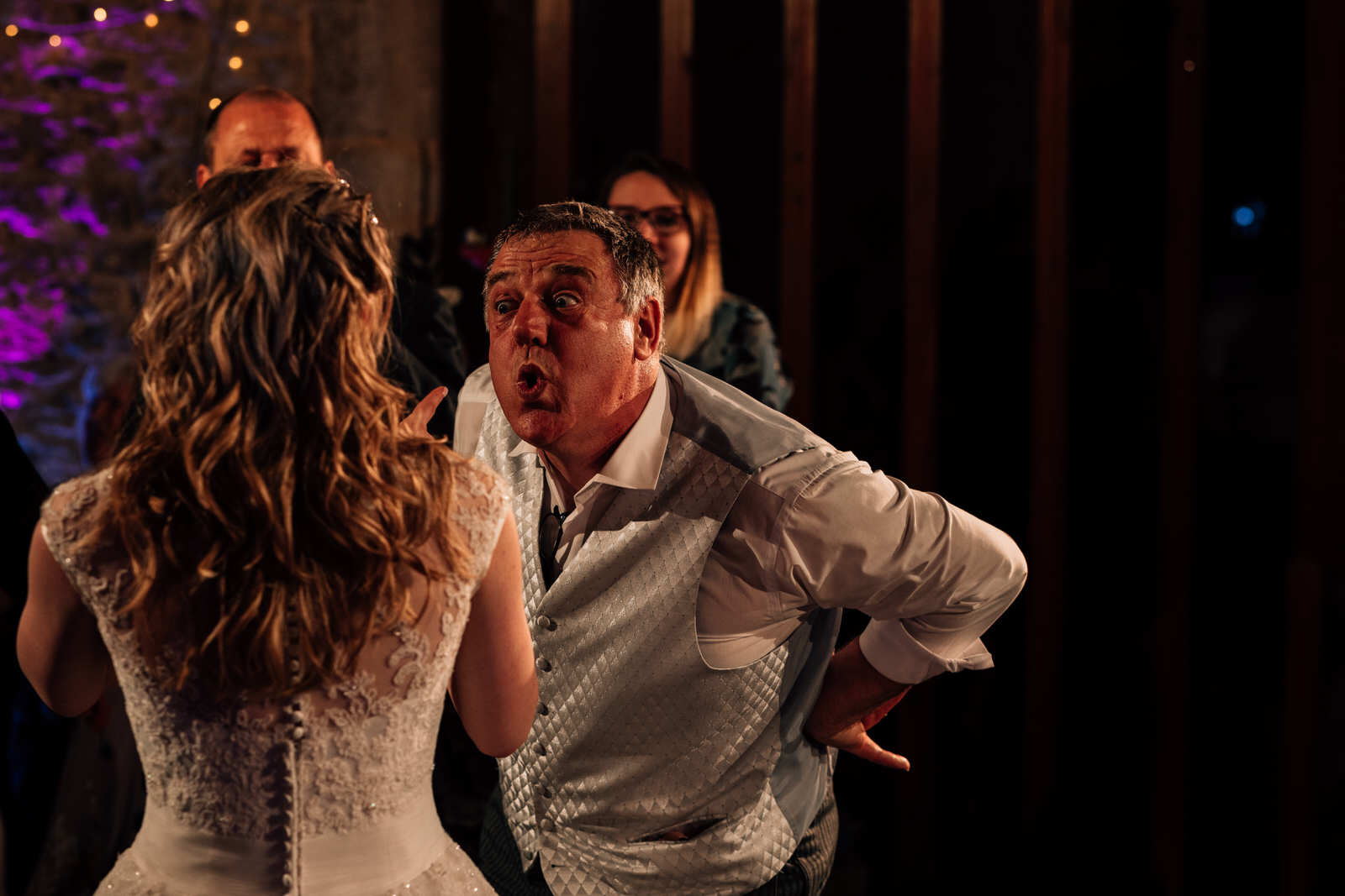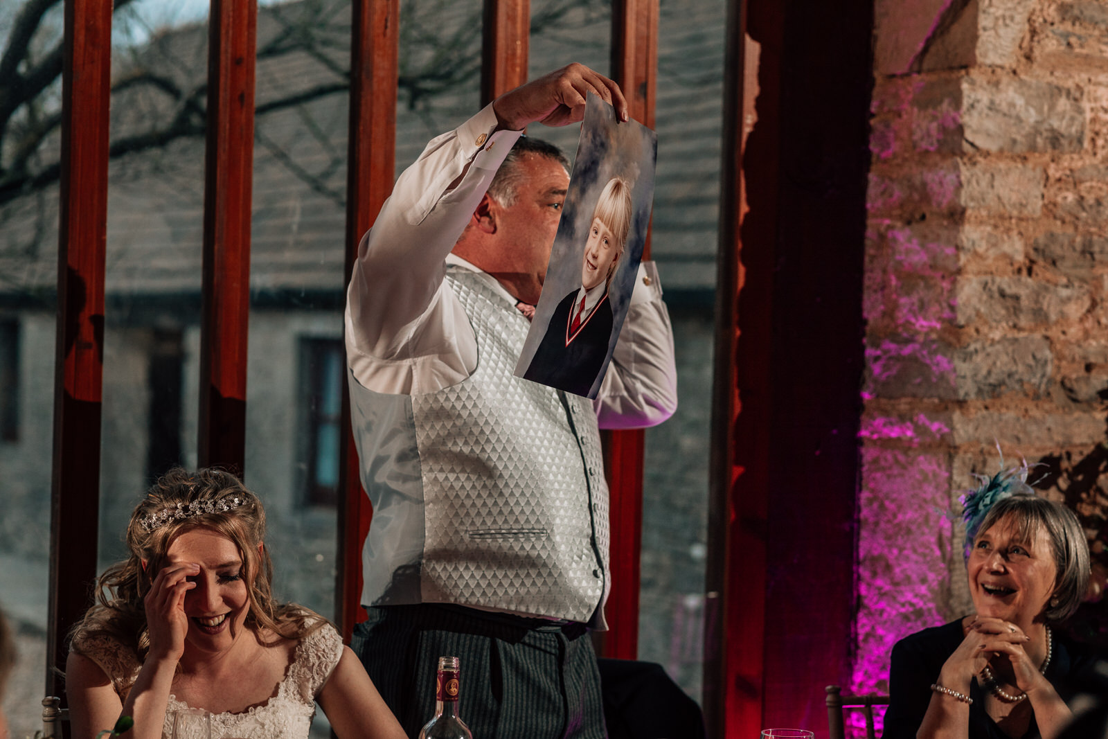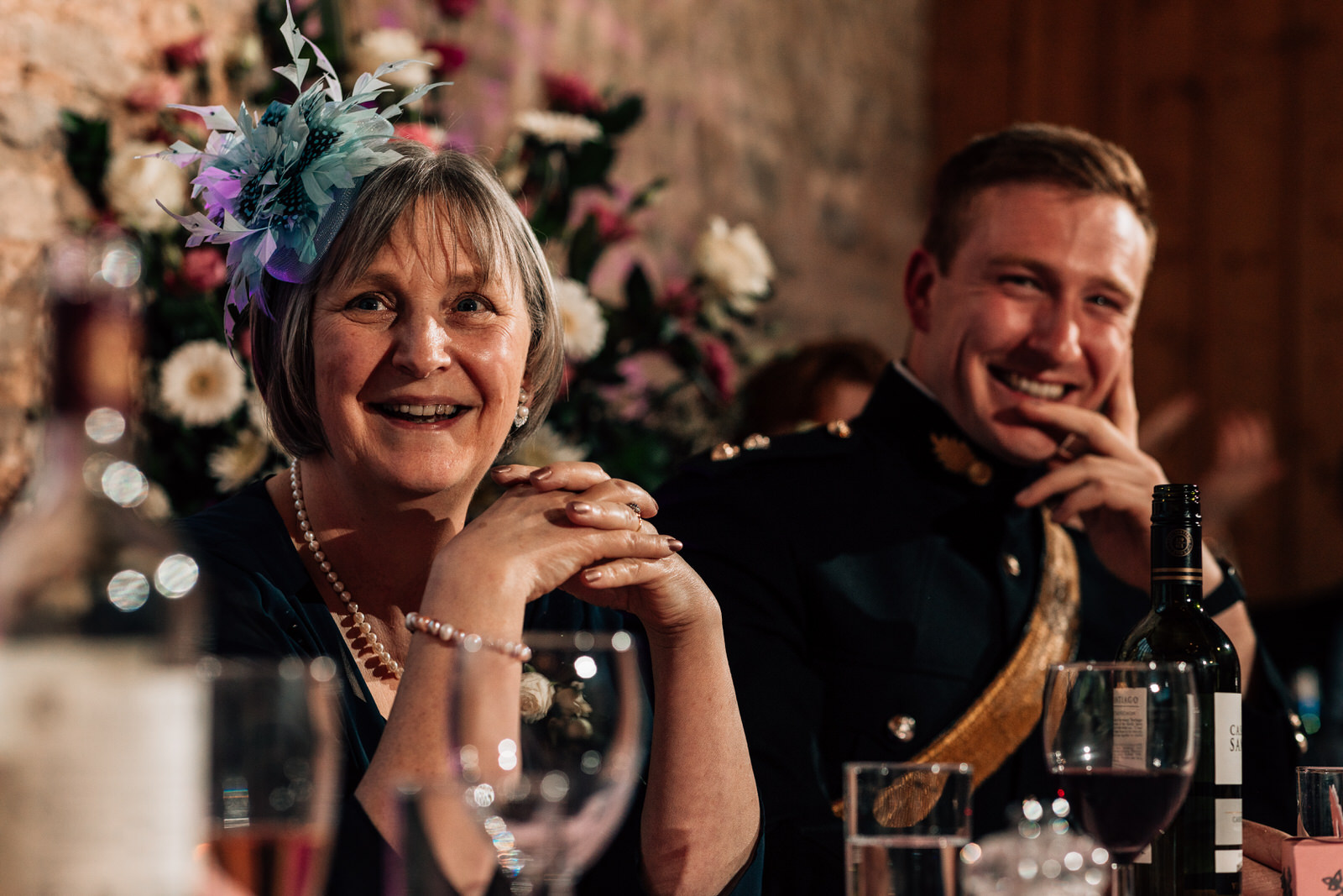 The reception and wedding breakfast were held in the farmyard style venue, with guests spilling out into the gardens during the reception. People were led to the wedding breakfast by Sarah, not with the traditional receiving line, but in her own style – a conga line.  Once in their seats caterers brought out ready to carve roasted beef with all the trimmings, each table getting their own beef to carve with the bravest guests taking the knife and playing chef.